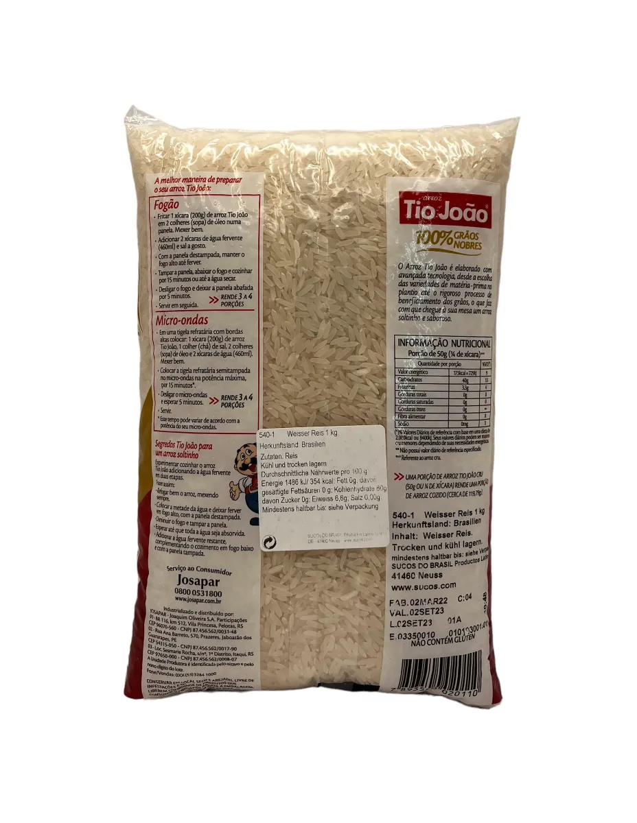 Der Reis von Tio João wird mit fortschrittlicher Technologie hergestellt, von der Auswahl der Rohstoffsorten zum Zeitpunkt der Anpflanzung bis hin zum strengen Prozess der Kornumwandlung, der garantiert, dass ein lockerer und schmackhafter Reis auf Ihren Tisch kommt
