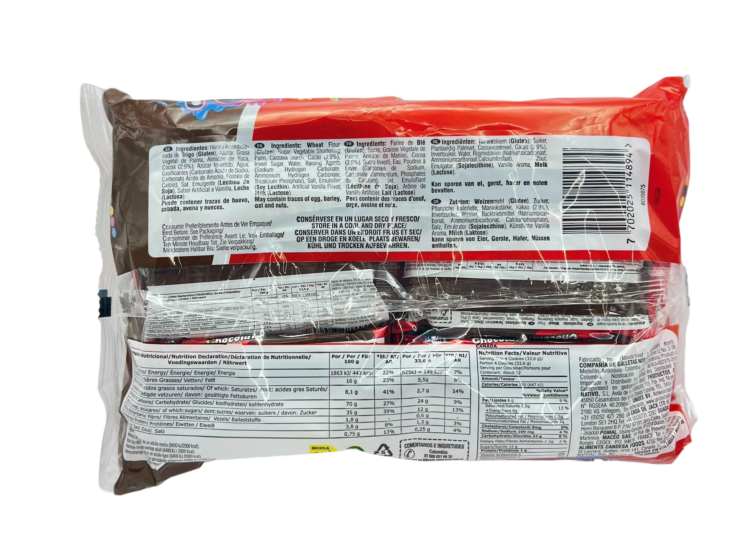 Weizenmehl (Gluten), Zucker, Pflanziche Palmfett, Maniokstärke, Kakao (2,9%), Invertzucker, Wasser, Backtriebmittel (Natriumbicarbonat, Ammoniumbicarbonat, Calciumphosphate), Salz, Emulgator (Sojalecithine), Künstliche Vanille Aroma, Milch (Laktose)