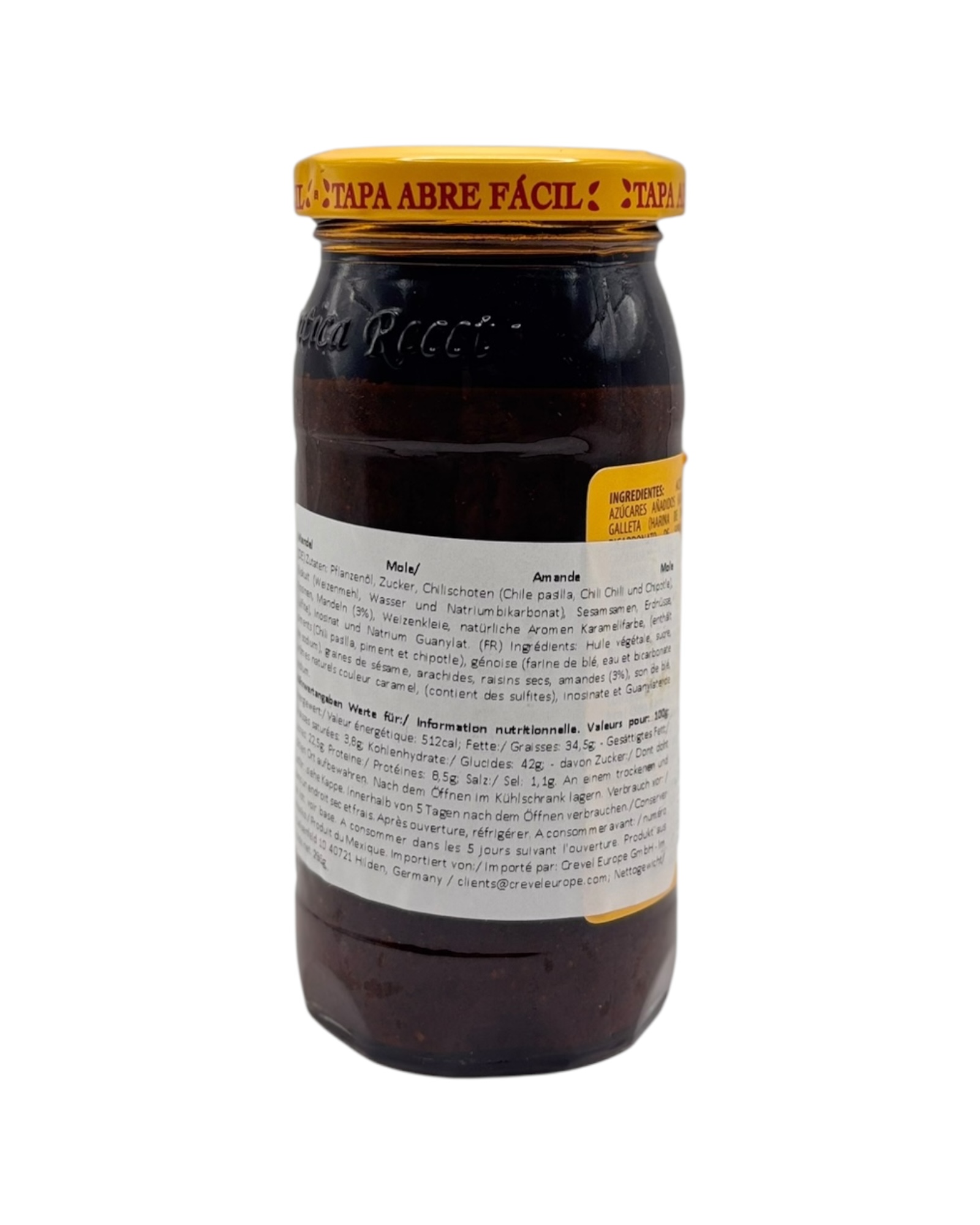 PPflanzenöl, Zucker, Chilischoten (Chile pasilla, Chili chili und Chipotle), Biskut (Weizenmehl, Wasser und Natriumbikarbonat), Sesam samen, Erdnüsse, Rosinen, Mandel (3%), Weizenkleie, natürliche Aromen Karamelfarbe (enthält Sulfite), Inosinat und Natrium Guanylat.