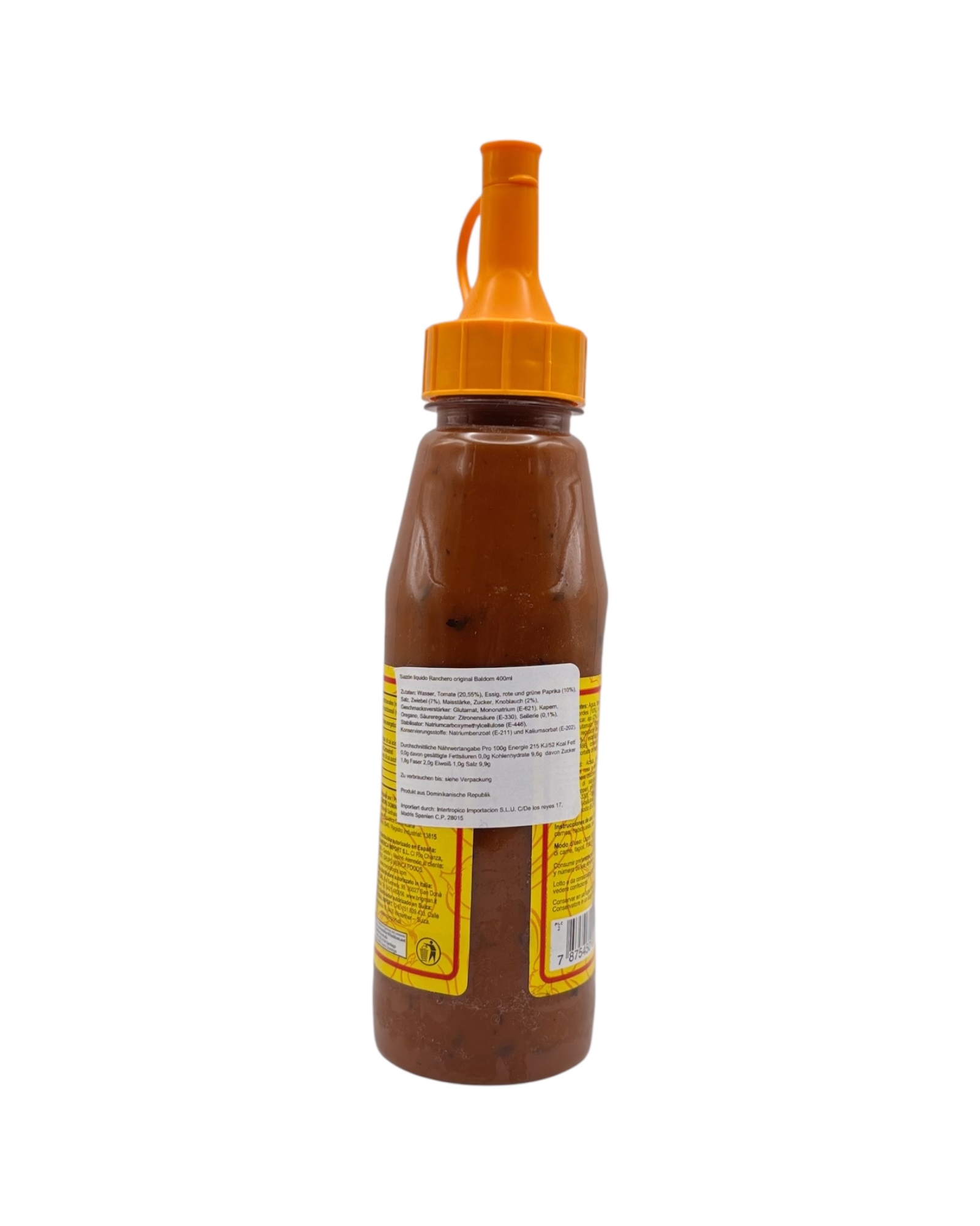 Wasser, Tomate (20,55%), Essig, rote und grüne Paprika (10%), Salz, Zwiebel (7%), Maisstärke, Zucker, Knoblauch (2%), Geschmacksverstärker: Glutamat, Mononatrium (E-621), Kapern, Oregano, Säureregulator: Zitronensäure (E-330), Sellerie (0,1%), Stabilisator: Natriumcarboxymethylcellulose (E-446), Konservierungsstoffe: Natriumbenzoat (E-211) und Kaliumsorbat (E-202).