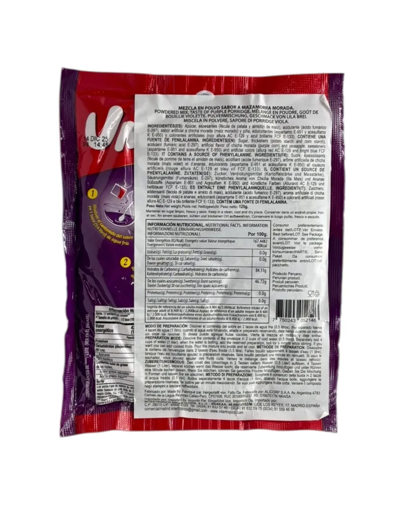Zucker, Verdickungsmittel (Kartoffelstärke und Maisstärke) Säuerungsmittel (Fumarsäure). E-2979, künstliche Aroma von Chicha Morada (Lila Mais) und Ananas Süßtoffe (Aspartam E-951 und Acesulfam K E-950) und künstliche Farben (Allurarot AC E-129 und hellblauer FCF E-133).